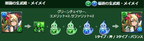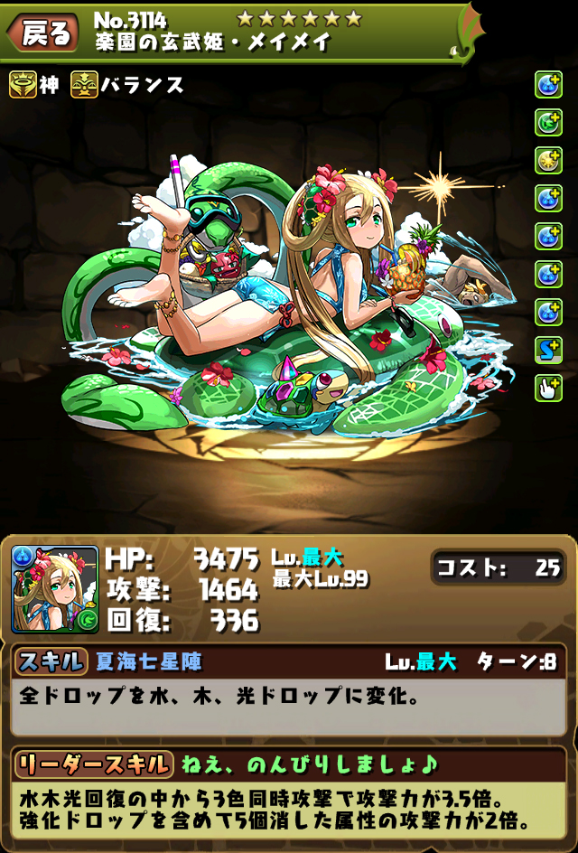 スキル | 夏海七星陣 全ドロップを水、木、光ドロップに変化。 |