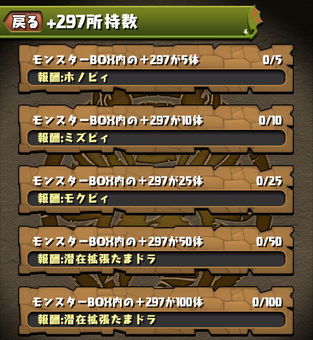 ※「+297所持数」「覚醒数」のクエストは、報酬を「受け取る」ボタンを確認する前にモンスターの合成や売却等をすると数が減り条件が未達成となってしまうのでご注意ください。