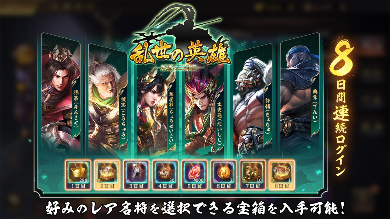 ログイン2日目に名将3択宝箱×1個を、8日目のログインで名将6択宝箱×1個を獲得でき、それぞれの宝箱を開ければ計6体のレア武将の中から1体選択して入手できるのがポイント!