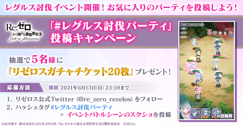 本キャンペーンでは、公式Twitterをフォローしたのち、ハッシュタグ「#レグルス討伐パーティ」をつけて、イベントバトルシーンのスクショを投稿すると、抽選で5名に「リゼロスガチャチケット」20枚が当たります。