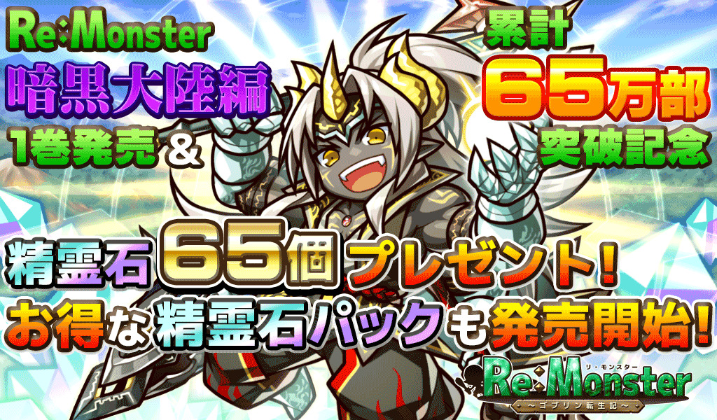 『リ・モンスター(Re:Monster)』にて、本日2018年6月21日(木)より、⼩説新刊発売とシリーズ累計発⾏部数65万部突破を記念したキャンペーンが開催中です。本キャンペーンでは、全ユーザーを対象に精霊石65個がプレゼントされます。