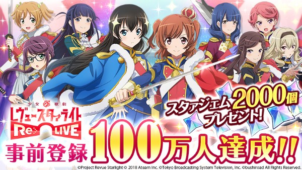 『少女☆歌劇 レヴュースタァライト -Re LIVE-(スタリラ)』にて、事前登録キャンペーンの参加数が100万人を突破しました。