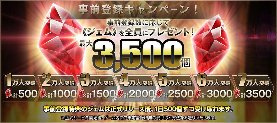 公式サイトから事前登録を行うと、最大3,500《ジェム》を貰えるチャンスです。事前登録キャンペーンの登録数に応じて、豪華特典を全てのユーザーにプレゼント!