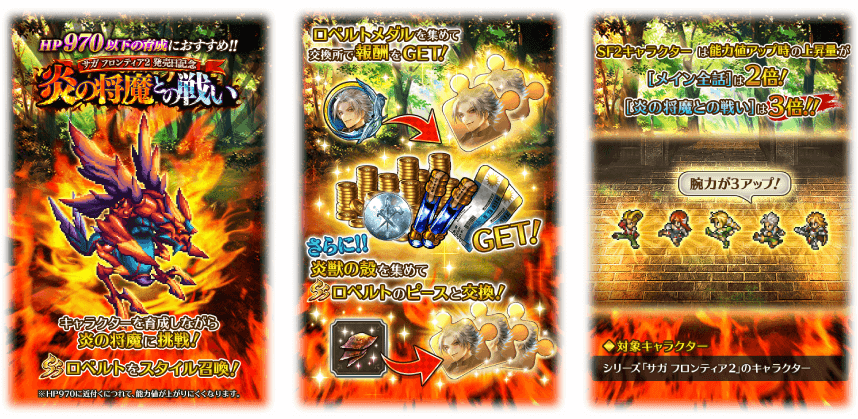 本キャンペーンでは、「SF2」キャラクターの能力値アップ時の上昇量が「炎の将魔との戦い」では3倍、メイン全話では2倍になります。