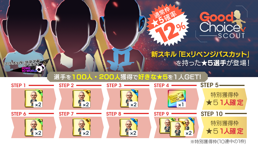 本スカウトでは、通常枠の★5出現確率が12%となっているほか、STEP5とSTEP10の特別獲得枠が★5選手確定となります。