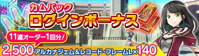 ■カムバックログインボーナス開催中30日以上遊んでいない方を対象に、通算7日間のログインで最大2,500アルカナジェムと★4スキルレコード2つ分を最大限まで強化できるレコード・フレームLが140個もらえる!カムバックログインボーナスは2/27(水)3:59まで!#SAOIF pic.twitter.com/esW9T9FEni