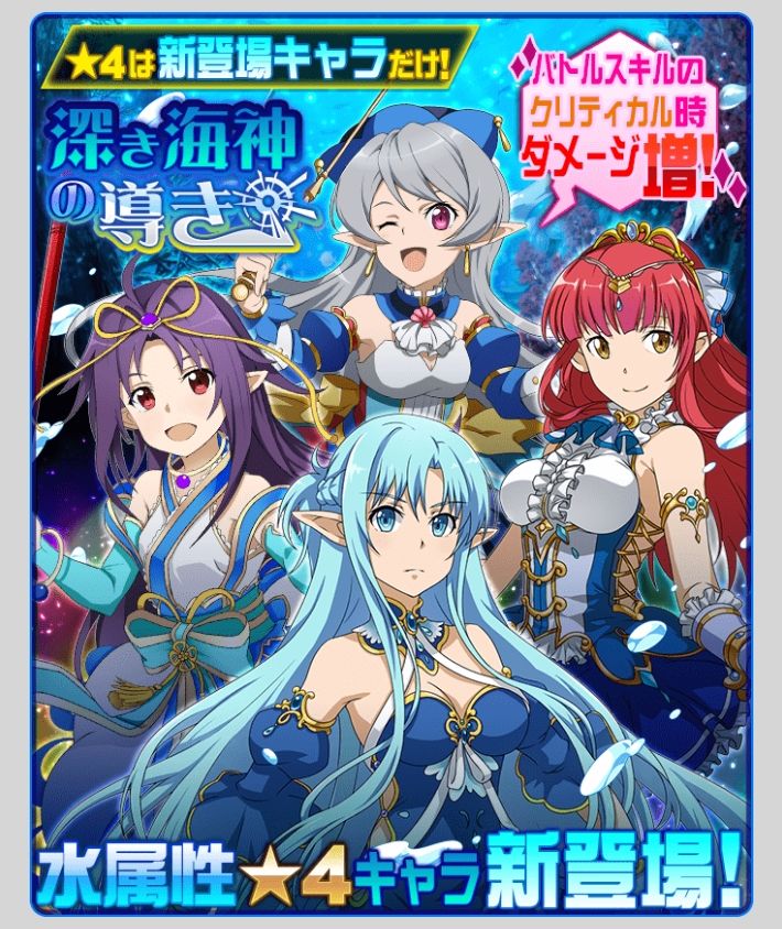 『ソードアート・オンライン メモリー・デフラグ』にて、期間中スカウトで登場する★4キャラが、新登場する水属性キャラだけになる「深き海神の導きスカウト」が開催されます。