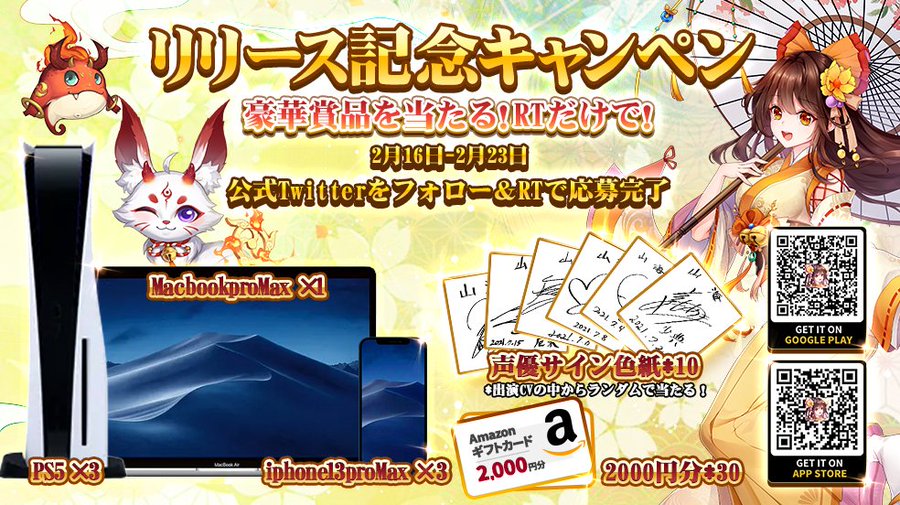 本キャンペーンでは、公式Twitterアカウント(@SENGAI18)をフォローし、対象ツイートをRTすると、抽選でMac book pro Max、iPhone13 pro Max、PS5、声優サイン色紙、Amazonギフトカード2,000円分などの豪華賞品が当たります。