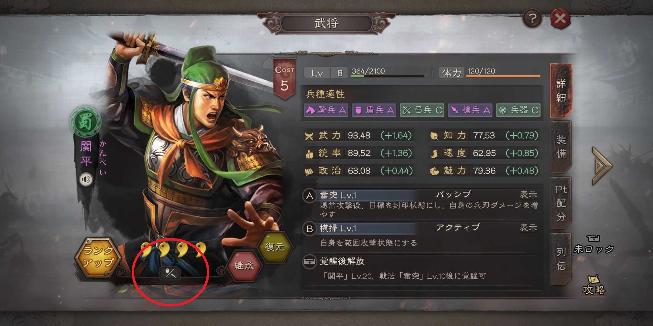 そして、各武将も「騎兵」「盾兵」「弓兵」「槍兵」「兵器」の5つのランクが設けられており、戦闘を有利に進めるなら兵種選択に合わせて相性が良い武将同士を組み合わせるといいでしょう。