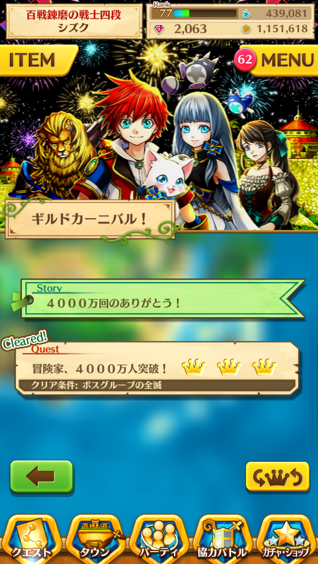 4000万ダウンロードを記念して新たな記念クエスト「ギルドカーニバル」 を開催します。