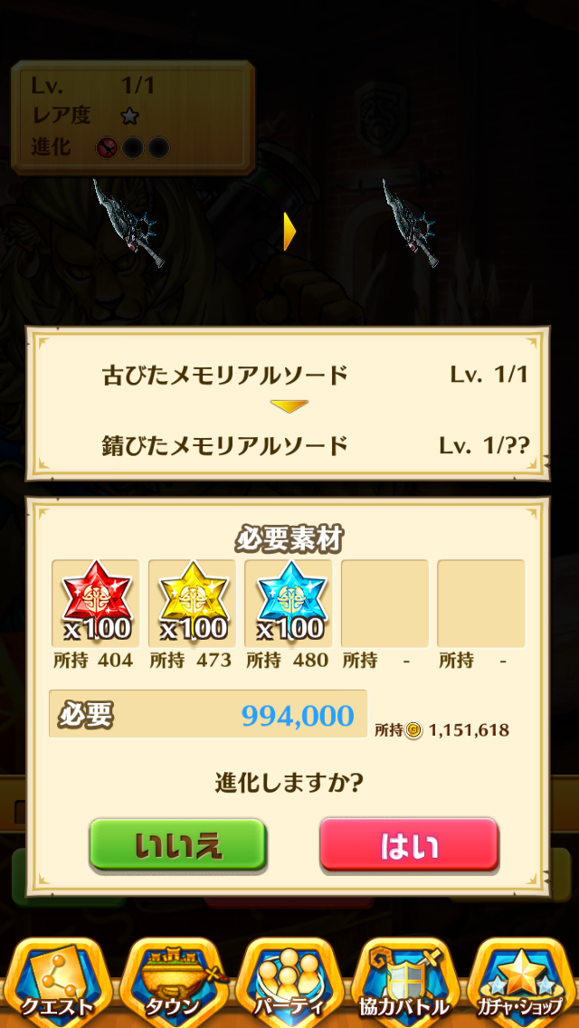 クエスト初回達成報酬でもらえる「古びたメモリアルソード」を進化させると「錆びたメモリアルソード」、さらに進化させると★4武器交換に役立つあの「メモリアルソード」に!