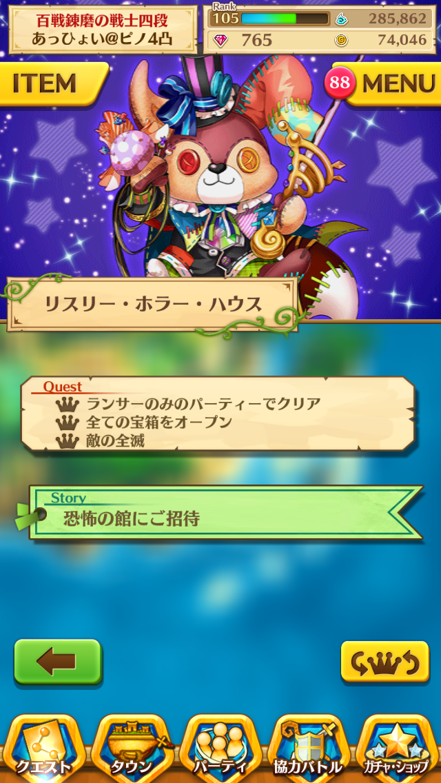 どうやらリスリーがお化け屋敷に入るストーリーのようですね。今回は主役がリスリーなのでサブミッションに「ランサーのみのパーティーでクリア」があるようです。