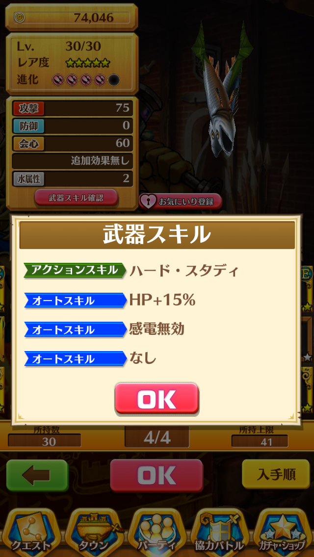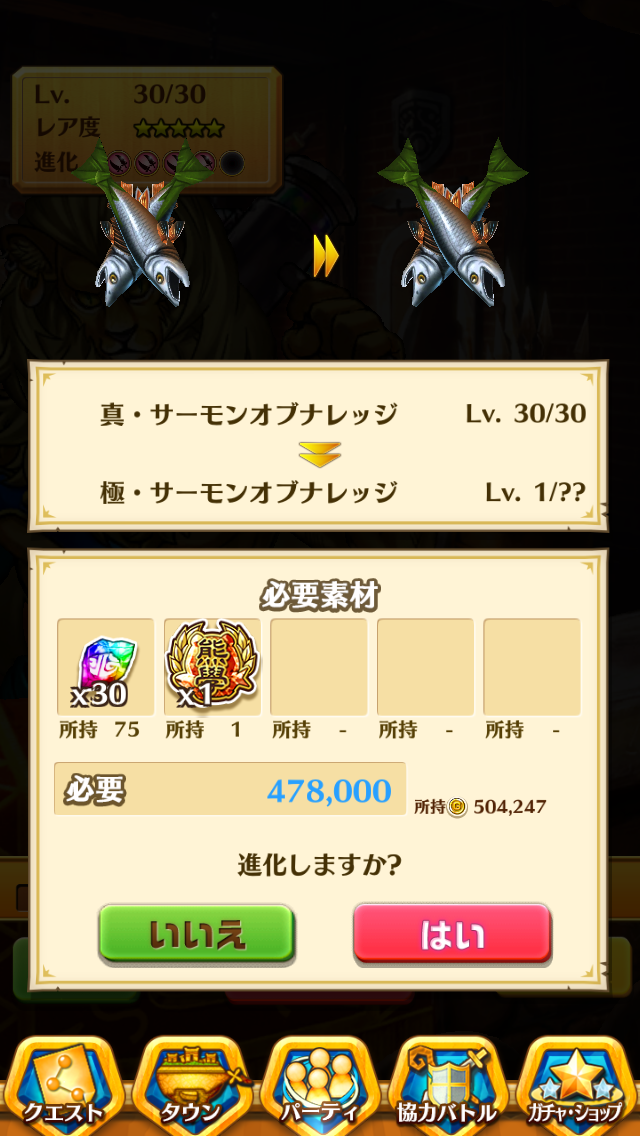 「サーモンオブナレッジ」の最終進化はこんな感じ。全体的に強くなっていて、さらにSP4%も追加されます。確実に入手しておきましょう。