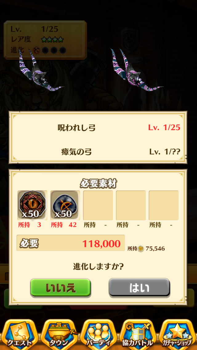 1日あたりのホスト回数制限付超高難易度クエストで「呪われし弓」の進化素材、「呪われし橙のルーン」を集めて最終進化を目指しましょう。