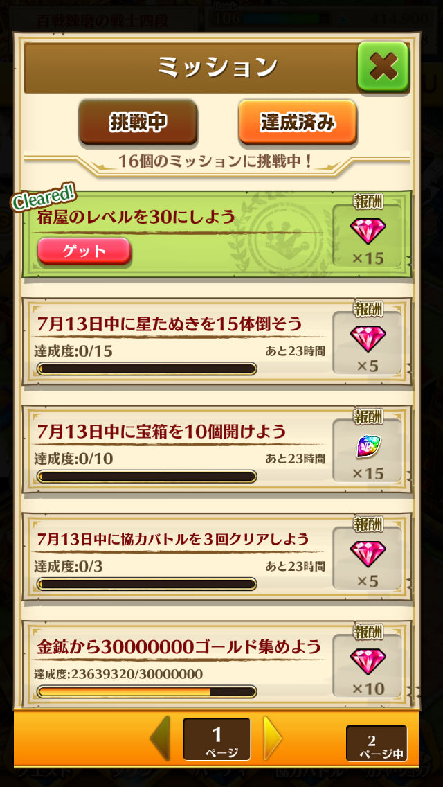 宿屋のミッションは6,12,18,24,30レベル達成で、ジュエルが合計45個ももらえます!