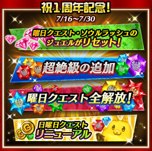 1周年を記念して、曜日クエスト全てに「超絶級」の追加、日曜日クエストのリニューアル、ソウルラッシュを含めた全クエストの達成報酬ジュエルリセットを実施!さらに、曜日クエストの全解放も期間限定で開催中!