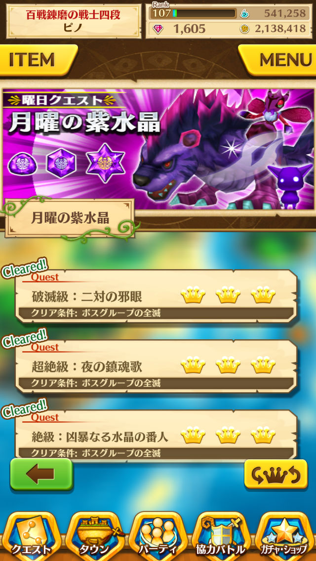 ▲こちらはリニューアルされた日曜クエスト破滅級。道中の敵は星たぬきゴールドではなく、アクーア種、コボルト種、ミニドラゴン種などが出現。報酬はゴールドが多く、ルーンが各色満遍なく出るようです。