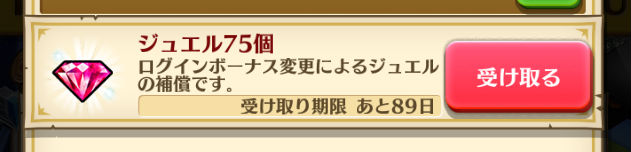通常ログインボーナスにてハイルーンが手に入っていた箇所が、7/13(月)をもって全てジュエル×5個に変更されました。