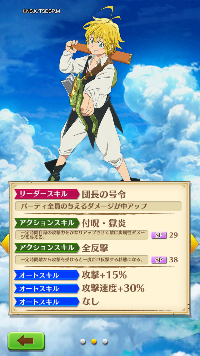 どの限定キャラも魅力的ですが、私の一番の狙いは、やはり「七つの大罪」の主人公「メリオダス」。オートスキルに攻撃速度+30%を持ち、原作に登場する必殺技「全反撃(フルカウンター)」も使用できるとの事で、すごく使ってみたい!