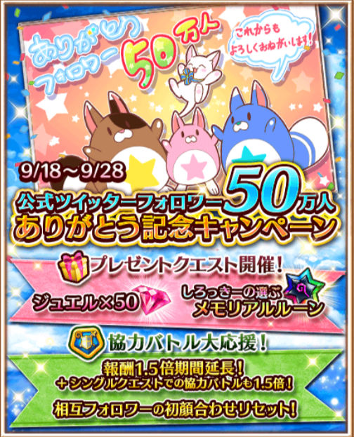 Twitterの『白猫』公式アカウントフォロワー数が50万人を突破しました!