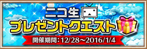 ※曜日クエストはクリア状況自体がリセットされ、協力バトルは初回クリア報酬のみリセットされています。ニコ生ゲーム内最新情報まとめ!▲お正月の限定ガチャに登場するキャラクターはこちらの記事でチェック!