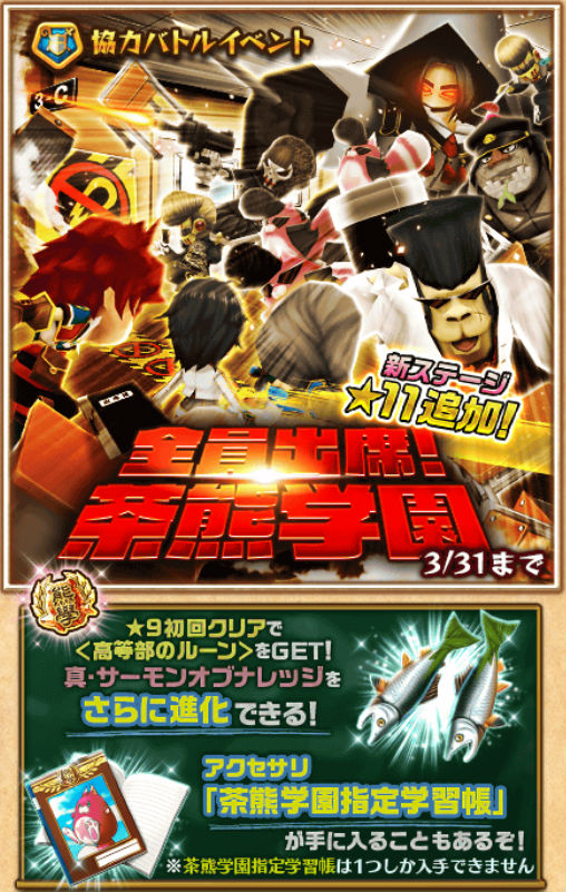 「茶熊学園2015」の限定武器「真・サーモンオブナレッジ」の進化に必要となる<高等部のルーン>が入手できるイベント「全員出席!茶熊学園」が、新たに★11のステージを追加して再登場!