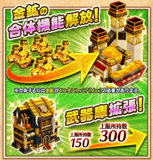 タウンの金鉱と武器庫がアップデートされ、金鉱は合体可能に、武器庫は上限所持数が300まで拡大されたぞ!