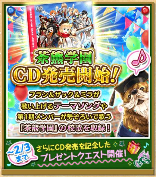 「茶熊学園」のテーマソングや校歌、ミニドラマまでもが収録された、『白猫』初の公式CD「校歌斉唱!私立茶熊学園」が、1/27(水)遂に発売!