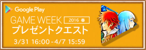 3/28(月)、Google Playの動画企画「GAME WEEK 2016春」で決定したプレゼントがもらえるプレゼントクエストが開催中。