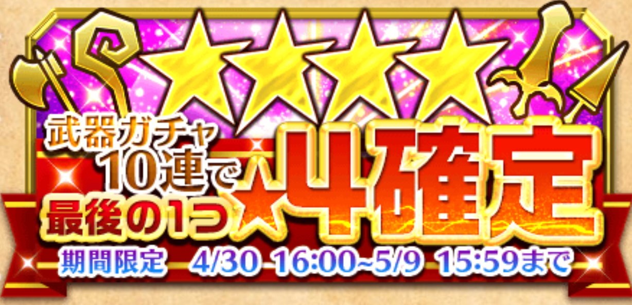 武器ガチャ10連で最後の1つが★4確定となるキャンペーンを実施中!