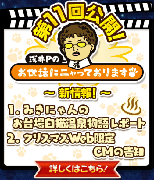 ゲームの最新情報こそないものの、開催中のリアルイベント「白猫お台場温泉物語」のレポートや、「白猫プロジェクトWeb限定CM(浅井Pver)」の情報など、楽しい情報満載となっているので、是非チェックしておこう!