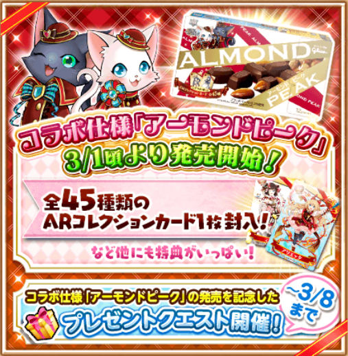 3/1頃より「白猫×黒猫×グリコ」コラボ仕様の「アーモンドピーク」が発売開始となり、記念のプレゼントクエストが開催中。
