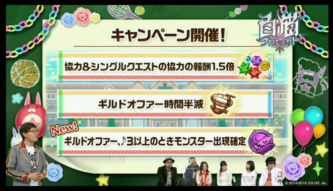 「茶熊学園2016」開校記念のお得なキャンペーンとして、いつもの協力バトル報酬1.5倍、ギルドオファー時間半減はもちろんのこと、今回初となる"ギルドオファー♪3以上のときモンスター出現確定"が実施!