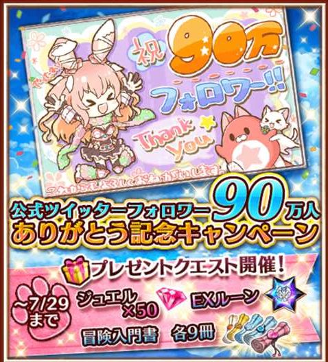 『白猫プロジェクト』公式Twitterアカウントのフォロワー数が90万人を突破し、EXルーンやジュエルがもらえる記念プレゼントクエストが開催中!