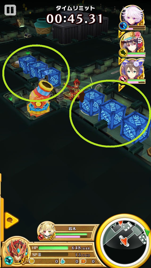 残ったメンバーに、長射程の操作可能ビーム系スキルを持つ、「カスミ(サマー)」「シズク」「シズク(クリスマス)」がいるなら、アクションスキル2で硬い壷を巻き込みながら、味方の進行の邪魔になる壷や箱をまとめて破壊してあげると良い。