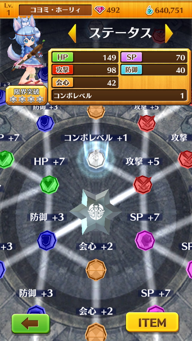「緑色」の「HP」、「青色」の「防御力」、「橙色」の「会心」も重要なステータスとなるので、最大レベルを目指して順次解放していきましょう。
