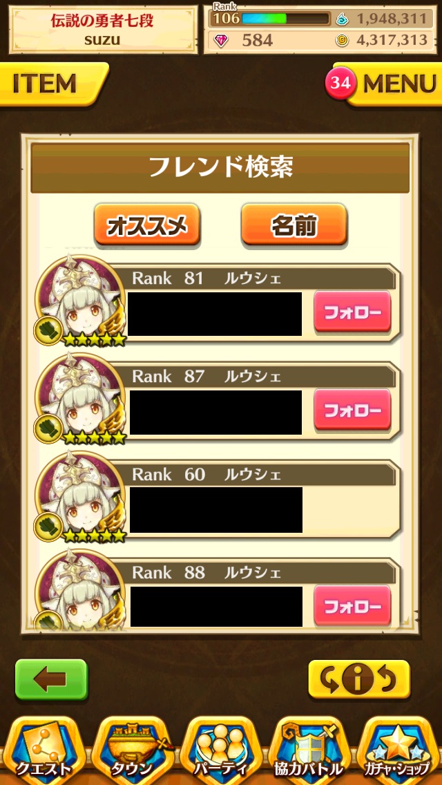 素早くフォローしたい人は、【MENU】→【フレンド】→【フレンド検索】→【名前】で"ルウシェ"と入力し、片っ端からフォローしておこう。