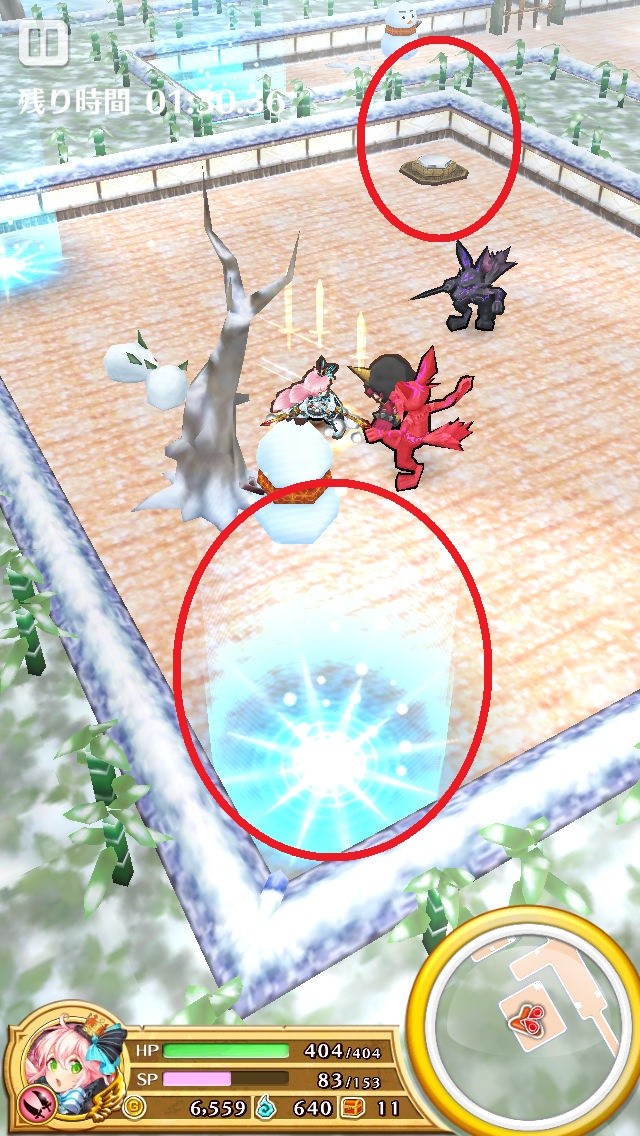 その後、ある程度SPが溜まったら属性ダメージ付きのスキルを使い、「キツネ」を倒して右の道の手前側のワープに入ろう。(左画像)