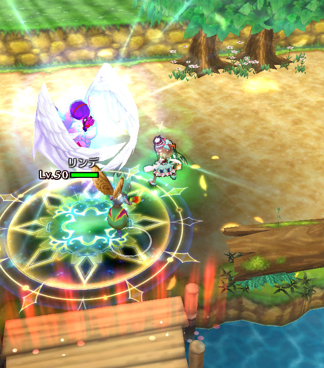敵にダメージを与え、味方が受けるダメージを20秒間50%軽減する。さらに味方に60秒間戦闘不能時に復活することができる効果を与える。※復活は1クエスト1回のみ