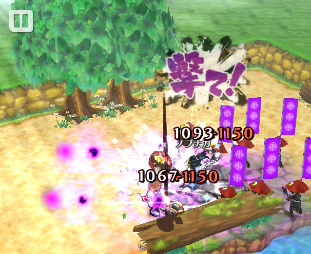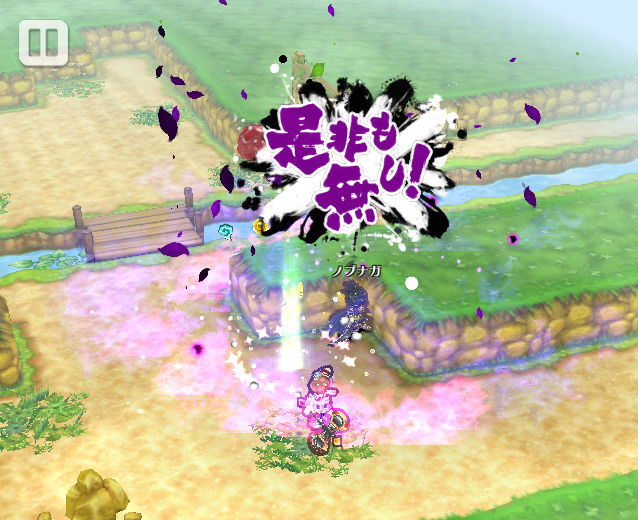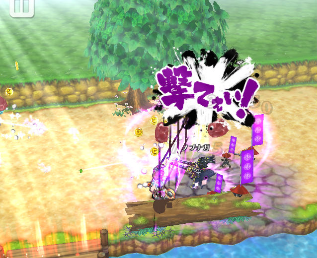 鉄砲隊が出現し、ノブナガの"撃て!、撃て!、撃てぇい!"という号令と共に、遠距離攻撃を3連射する。