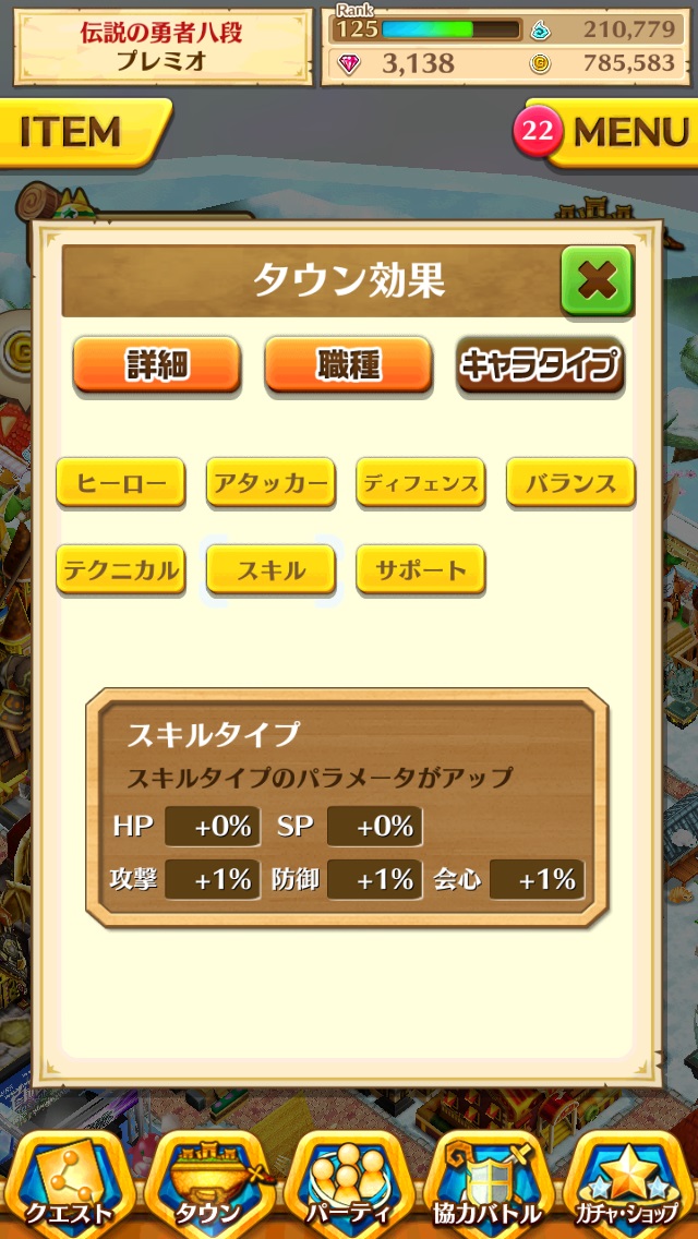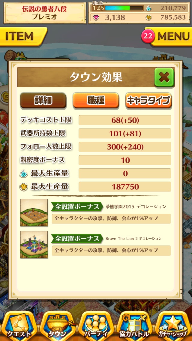 タウン右上の飛行島アイコンタップで確認できる"パラメータボーナス"に、全設置ボーナス、キャラタイプ別パラメータ情報の表示が追加され、さらに見やすく進化しました。
