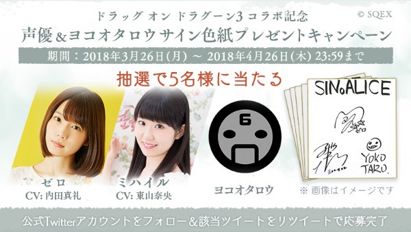 内田真礼さん(ゼロCV)、東山奈央さん(ミハイルCV)、ヨコオタロウさんのサイン入り色紙を抽選で5名様にプレゼント!