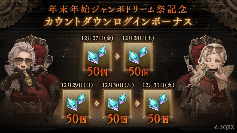 12月27日(金)0:00より、「年末年始ジャンボドリーム祭記念 カウントダウンログインボーナス」が実施予定です。