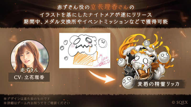 また、公式生放送企画から誕生した、立花理香さん(赤ずきん役)と藤田茜さん(ラプンツェル役)原案のナイトメア「麦酒の精霊リッカ」「人参の妖精アカーネ」が専用のメダル交換所に登場しています。