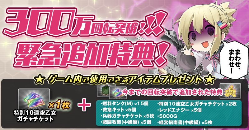 これを記念して、フライングガチャ300万回突破記念特典を配布します。