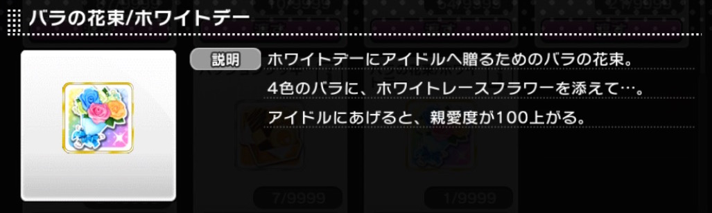 ログインで「バラの花束/ホワイトデー」が1つ貰えます。プレゼントから受け取りルーム内のギフト保管庫から使用することができ、アイドルにあげると親愛度が100上がるギフトとなっています。