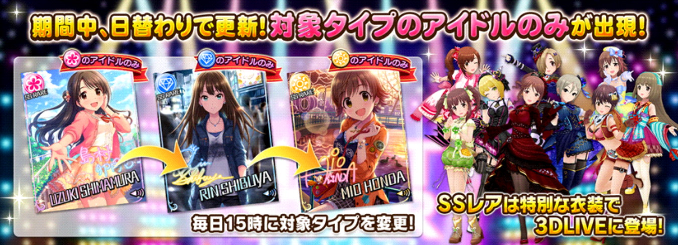 毎日15時に対象のタイプが変わるので、お迎えしたいアイドルの属性が出現する日程をチェックしておきましょう!