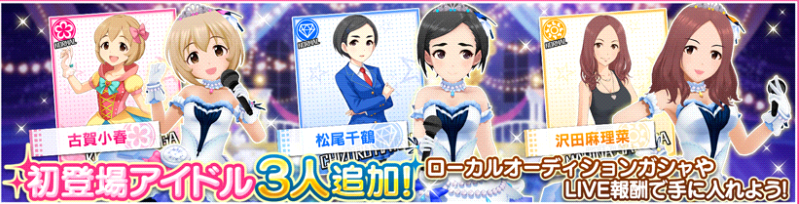 9月9日(金)より、初登場アイドル「古賀小春」「松尾千鶴」「沢田麻理菜」の3人が追加!LIVEやローカルオーディションガシャで獲得できます。