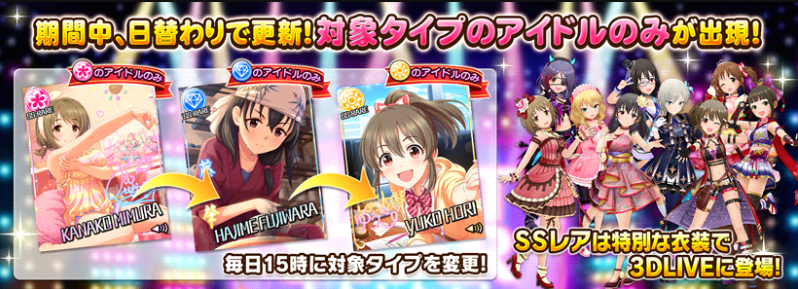 毎日15時に対象のタイプが変わるので、お迎えしたいアイドルの属性が出現する日程をチェックしておきましょう!