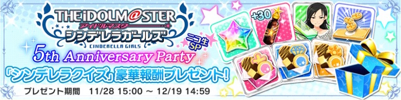 11月19日(土)に開催されたイベント「THE IDOLM@STER CINDERELLA GIRLS 5th Anniversary Party ニコ生SP」にて、出演者の皆さんが「シンデレラクイズ」を全問正解することができました。